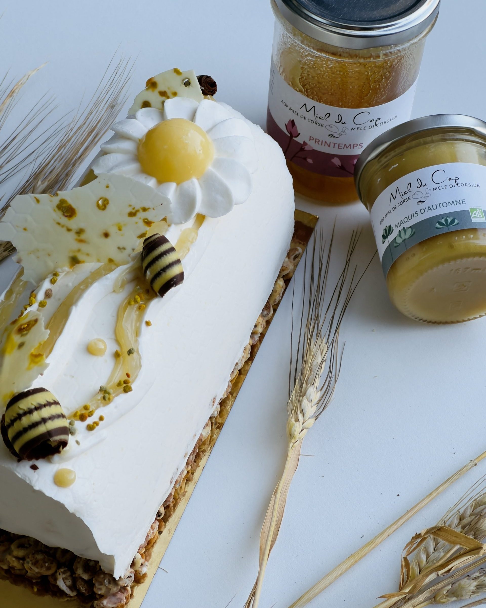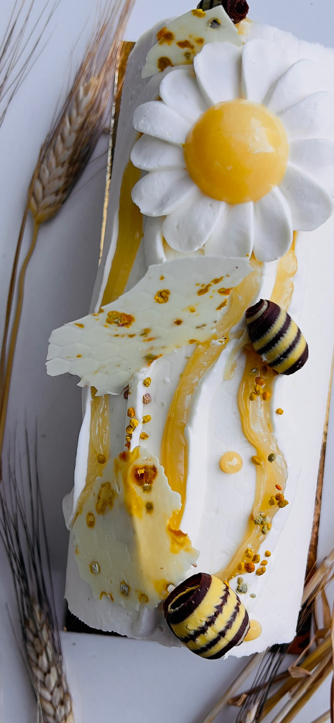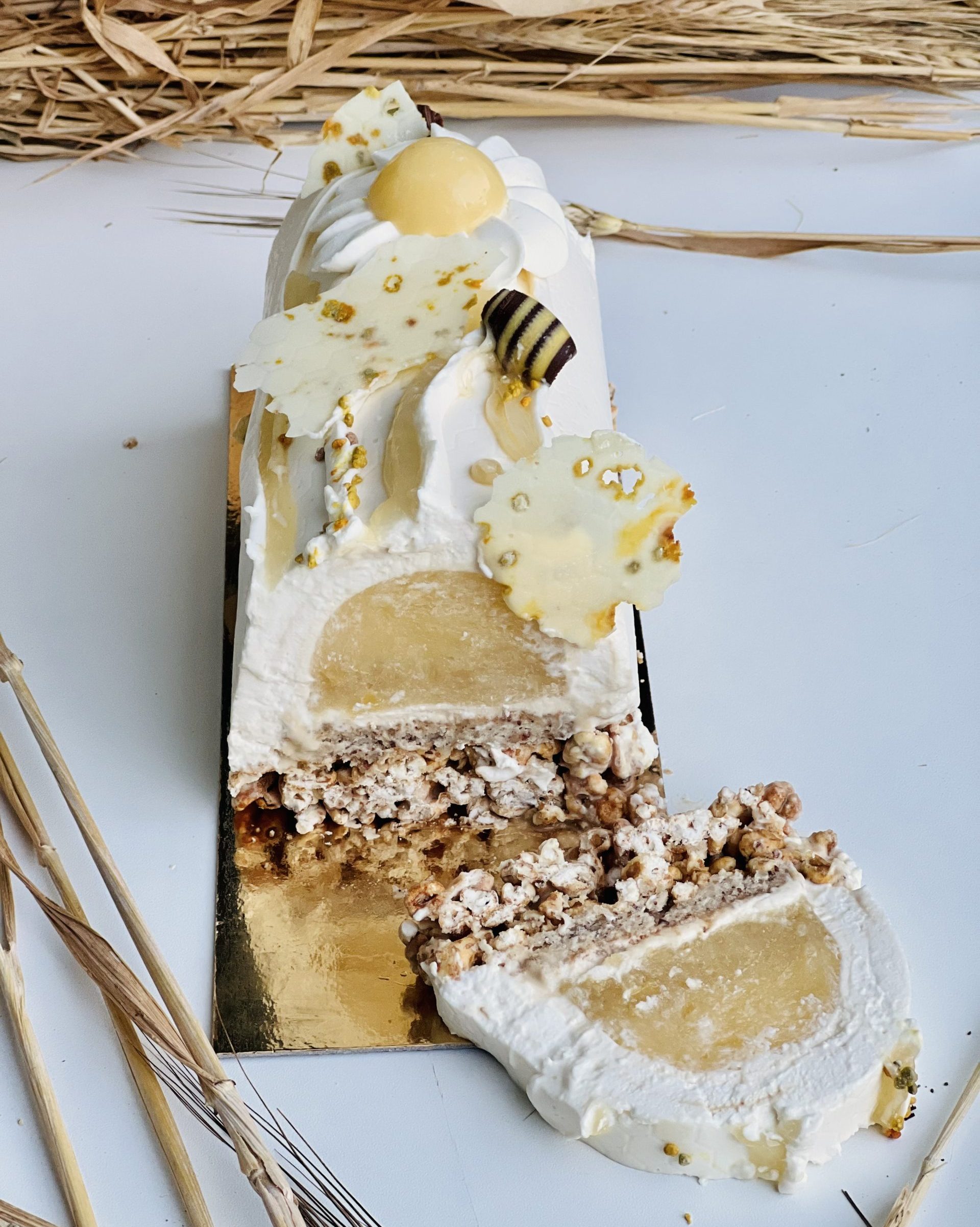 Croustillant épeautre soufflé & miel façon « rose des sables », dacquoise amande et miel, marmelade de citron confit, lemon curd, mousse légère au yaourt, pollen, gel citron miel, alvéoles en chocolat blanc
