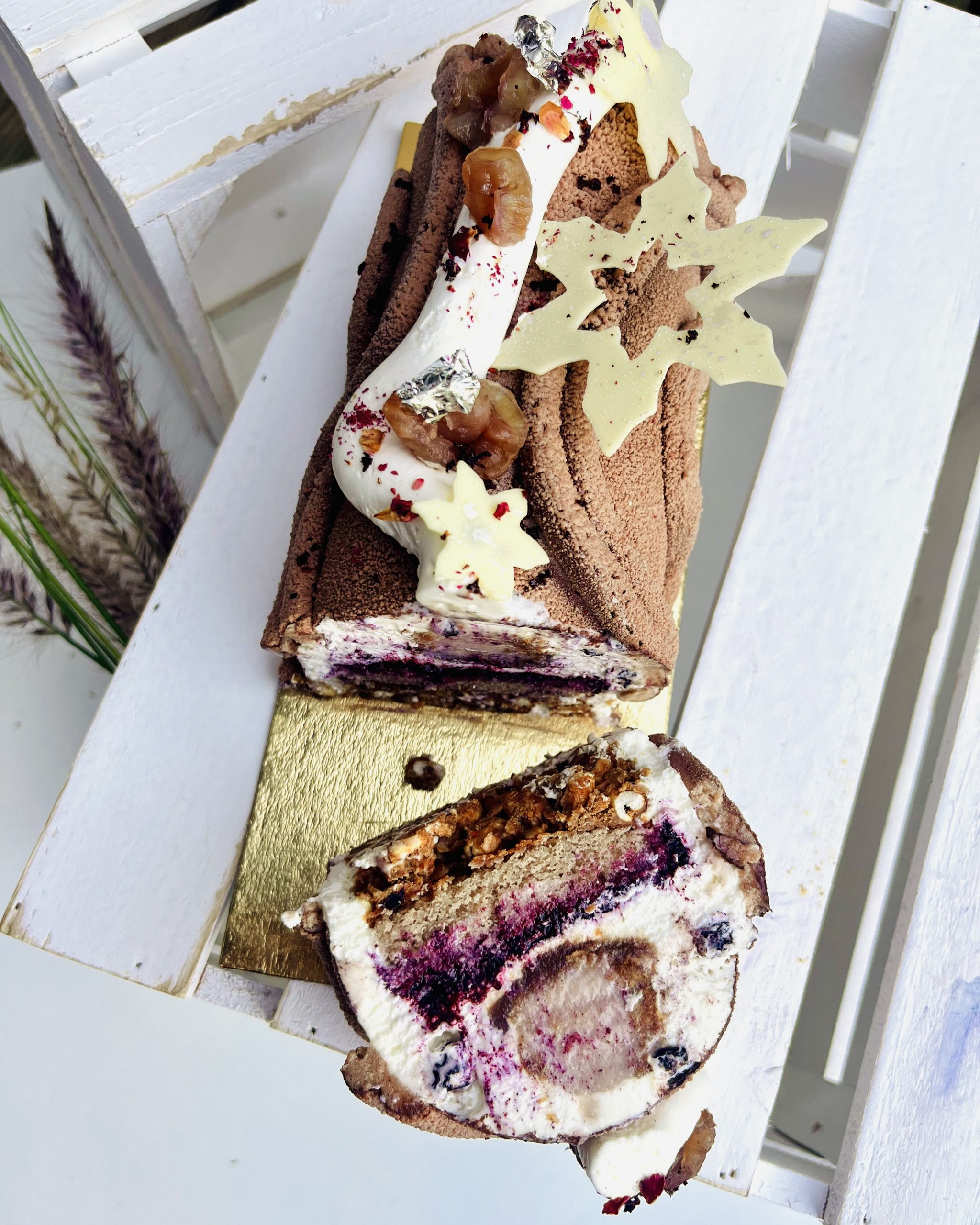 Croustillant praliné noisette & miel de châtaignier, biscuit moelleux châtaigne, confit de myrtille sauvage, mousse vanille aux éclats de myrtilles, gel marron, crème de marron & éclats de marrons confits