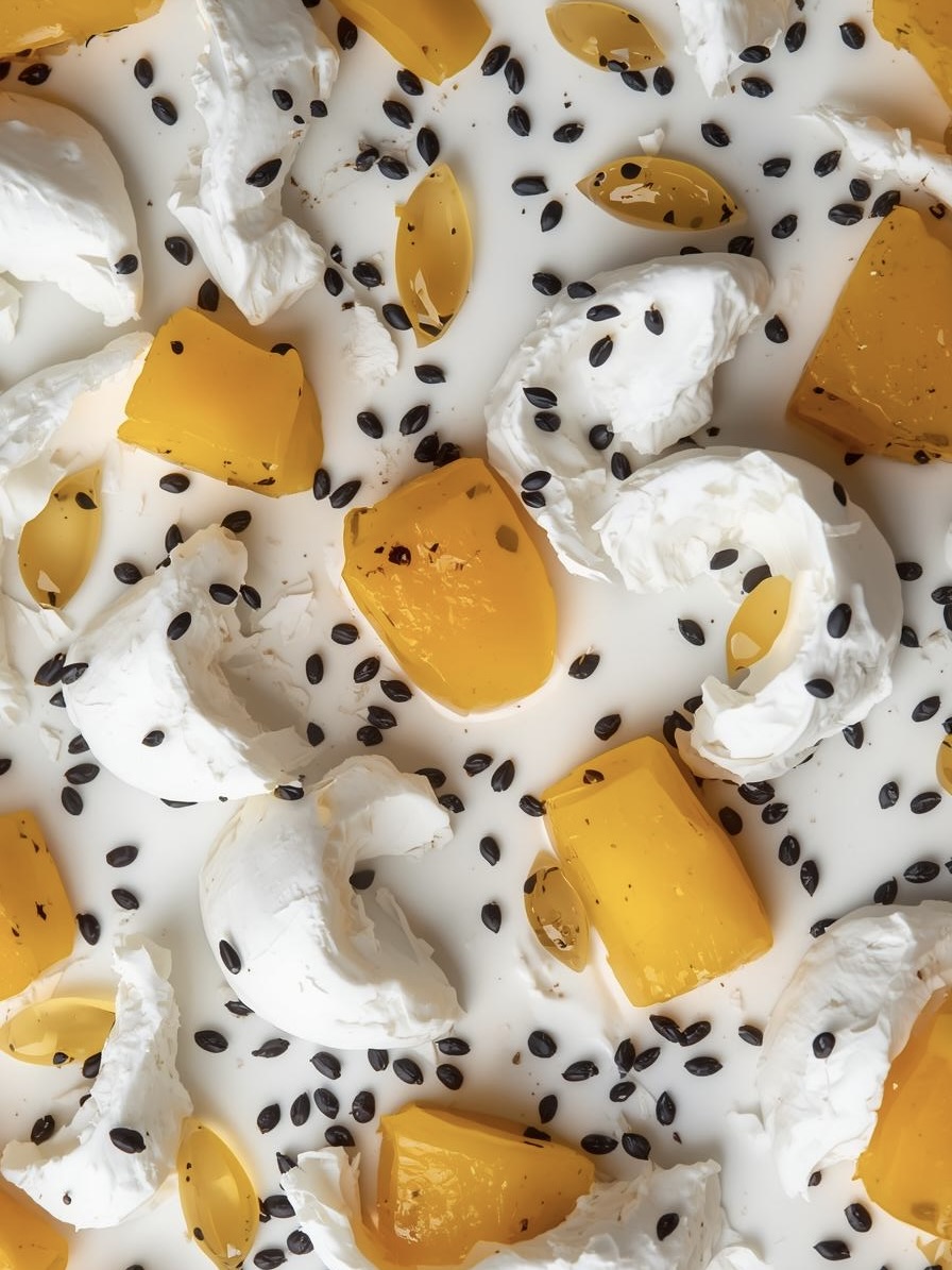 Meringue suisse en coeur, crémeux mangue et fruit de la passion, tartare de mangue, fruit de la passion et zestes de citron vert, chantilly mascarpone au sésame noir, fruits frais