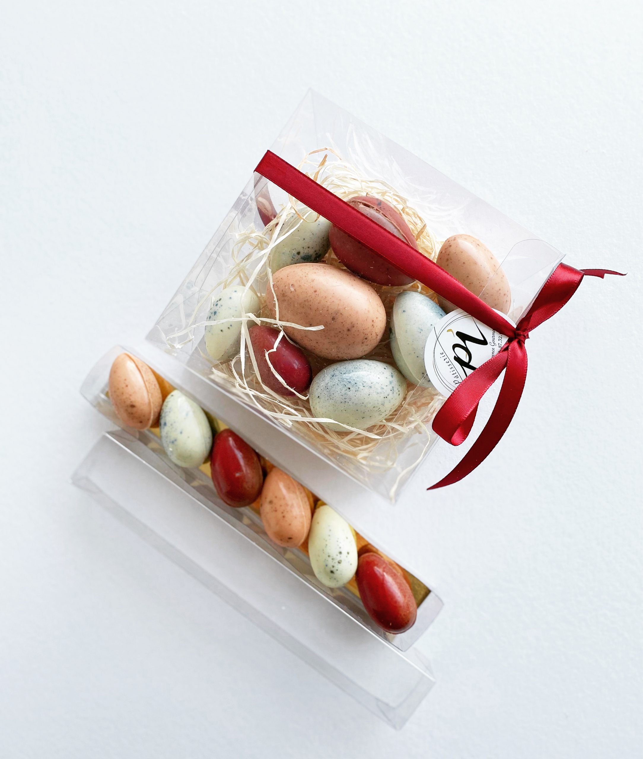 Oeufs en chocolat au lait et blanc garnis de croustillant praliné cacahuète